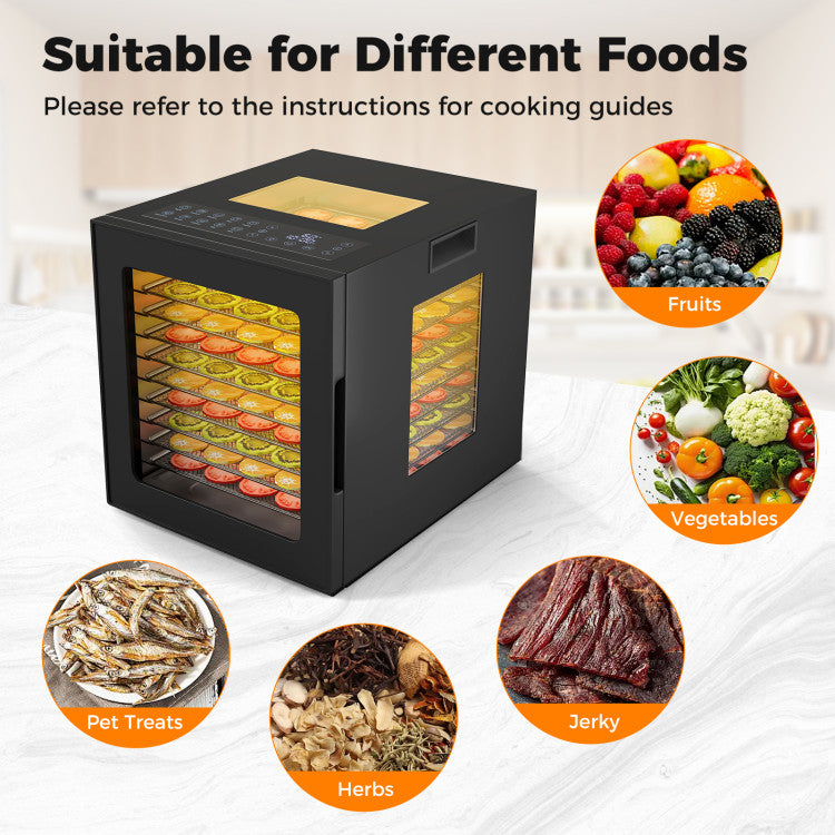 ● Enhanced Visibility Design: The food dehydrator has 4-sided viewing windows, ensuring you can keep an eye on your culinary creations from the top, front, left and right. With bright LED lights inside, it is more convenient for you to observe the state of your food.