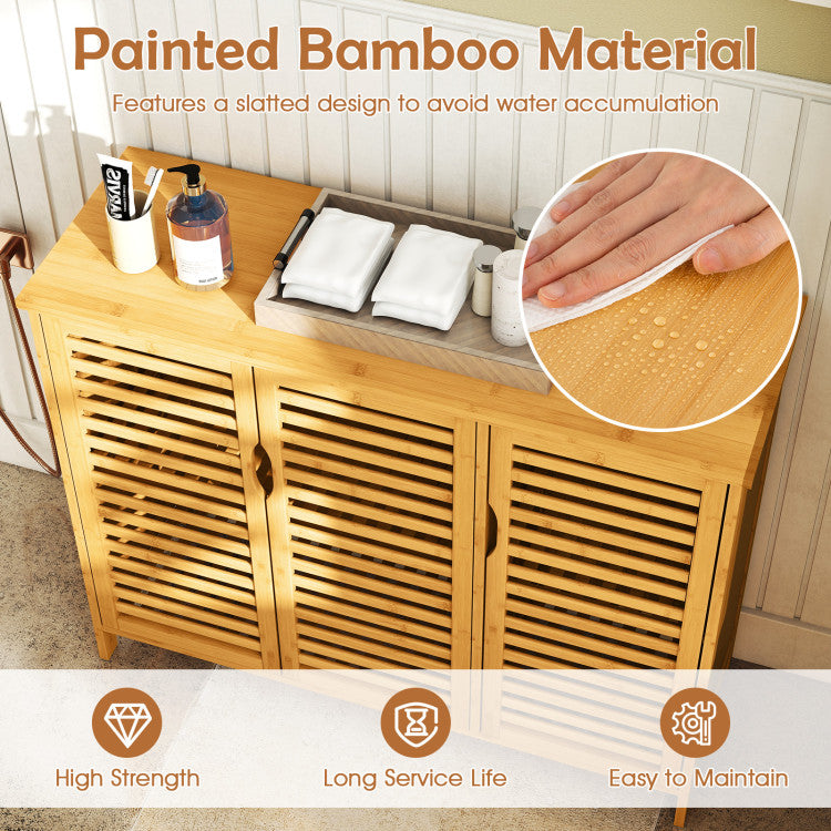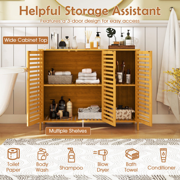 Discover practical, natural storage with this freestanding bamboo bathroom cabinet — a 3-door storage organizer designed to tidy toiletries, towels, and everyday essentials while adding warm, eco-friendly style to any room. Built from sustainable bamboo, the cabinet offers adjustable shelves behind each door so you can configure space for tall bottles, folded linens, or decorative baskets; its compact footprint fits neatly in bathrooms, entryways, or living rooms without crowding. The included anti-tipping kit anchors the unit to the wall for family-safe stability, and doors close smoothly to keep contents dust-free and out of sight. Bamboo’s natural resistance to humidity makes maintenance simple: wipe with a damp cloth, dry thoroughly, and avoid harsh chemicals to preserve the finish. Whether you want a dedicated linen station near the shower, a neat catch-all in the foyer for shoes and keys, or a tasteful media-storage accent in the living room, this versatile organizer balances utility and design. Easy assembly and a timeless silhouette mean you gain functional storage that looks curated and performs reliably for everyday living.