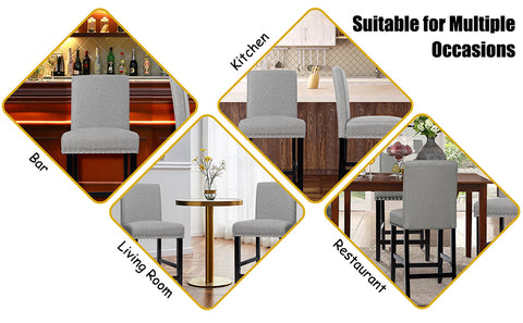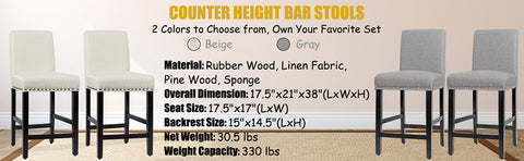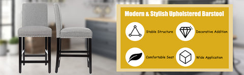 Featuring hard wood legs and wood construction, these barstools provide great sturdiness and stability. And, the seat cushions of these barstools are made of environmentally friendly, breathable linen fabric and extra soft cushioning, increasing comfort. Leaning on the wide back, sitting on the thick cushion, and resting your feet on the sturdy footrest, you’ll enjoy countless hours of superior comfort. Fill your home with elegance and comfort with this set of chairs.