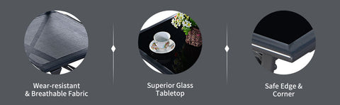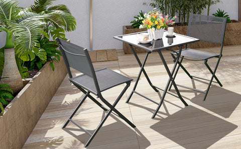 It is made of durable steel and fabric. It includes 1 glass top folding table and 2 foldable chairs. The chairs and table are very lightweight, you can tuck it away when you finish your dinning. The deft design will suit for your modern home decoration.