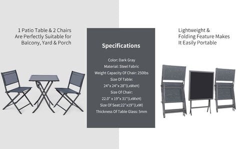 - Folding Chairs and Table: The folding design is for convenient transport and storage. It saves space when not in use. You can take the chairs and table anywhere you need it too.