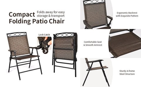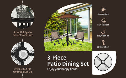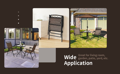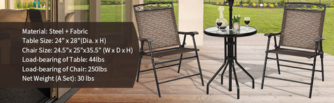 ● 3 Pcs Bistro Conversation Set: A comfortable relaxing area is made up with 2 folding chairs and a round tempered glass table to conduct a private conversation or have dinner with best friends. It's easy to change your outdoor furniture layouts for an optimal new look to get the mood strikes. Perfect for your living room, backyard, beside pool or garden.