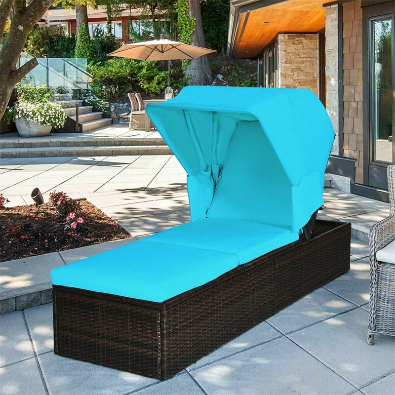 - Retractable Awning: This outdoor rattan chaise longue chair is designed with a retractable awning to meet your different needs. On the one hand, with the canopy closed, you can sunbathe in the warm sun. On the other hand, open the canopy on a hot day and you'll feel cooler.