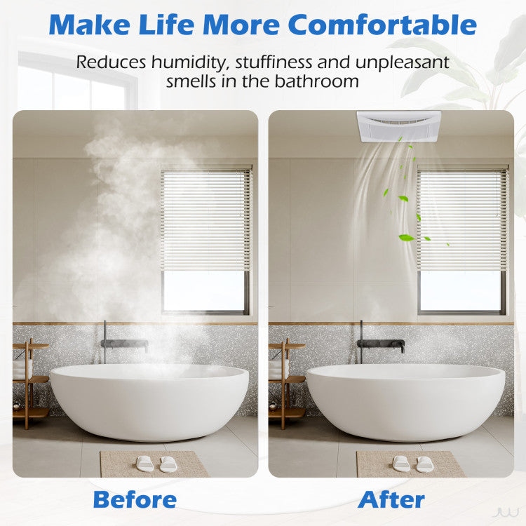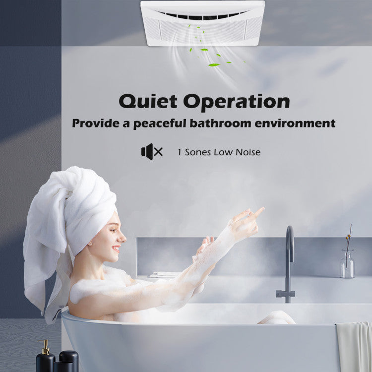 ● Quiet Operation: This ceiling mounted exhaust fan works quietly at 1 sones, which provides a peaceful bathroom environment. It is perfect for ensuring your early morning or late-night routines are undisturbed by noise.
